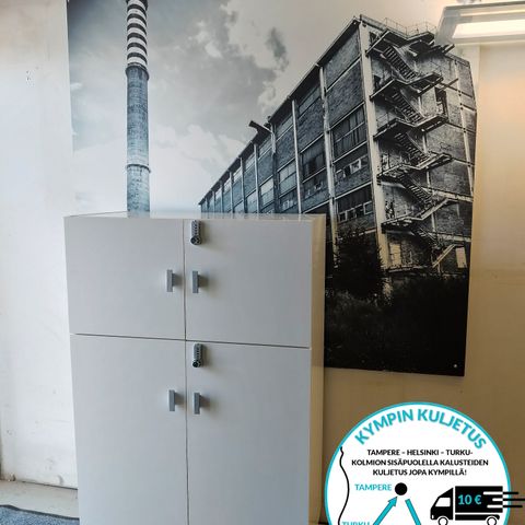 Martelan lukittava liukuovikaappi, kätevästi pyörillä liikuteltava. Valkoinen runko ja tummat liukuovet. Varastossa 2kpl. Kaapit Kuopion toimipisteessä, liikkuvat tarvittaessa toimipisteestä toiseen.