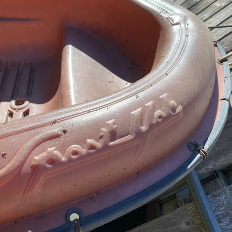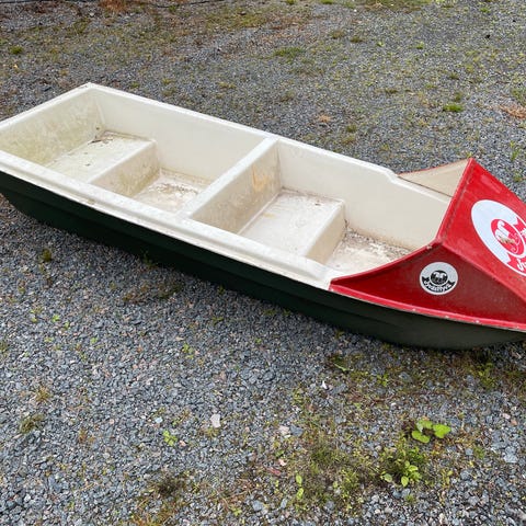 Vanha lasikuitujolla johon asennettu hankaimet. Airoja ei ole. Jollan koko on 237 cm x 110 cm.