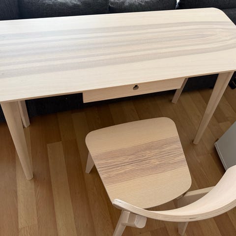 It is in very good and clean condition. It has a drawer and soft pads on the bottom of legs.