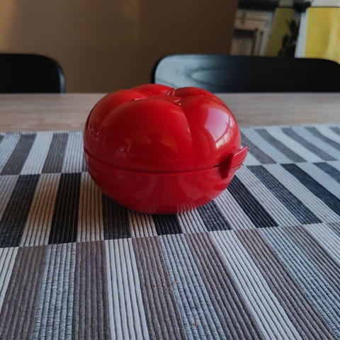 Myydään erittäin hyväkuntoinen Tupperwaren tomaatin muotoinen punainen rasia.