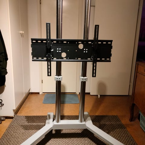 Myydään TVn lattia teline pyörillä. Ostettu verkkokauppa.com:ista noin 3 vuotta sitten. Korkeus säätö 120-180cm, sopii 37-70 tuumaisille tv:ille.