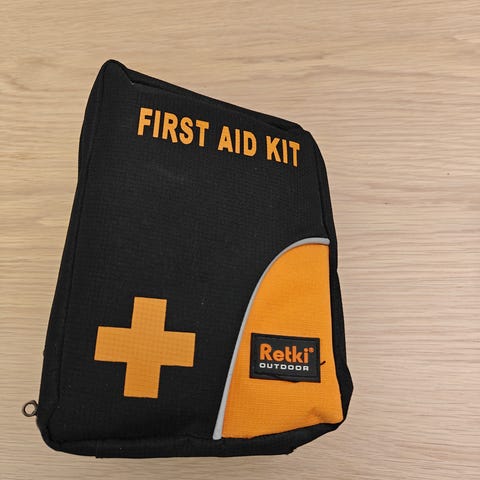 Kevyt, vedenpitävä ensiapupakkaus jossa tarvittavat perustarvikkeet sisältäen lisäksi aurinkorasvan.