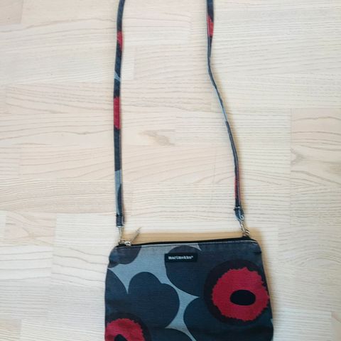 Marimekko, hihna unikkokankaalla. Toinen puoli keinonahkaa, väri beige. Metalliosat hopen väriset. Kts.kuvat.