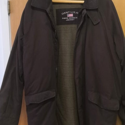Gantin tummansininen takki, koko XL, sivuissa nepparitaskut ja sisällä 2 taskua (toinen vetoketjulla), hihansuiden ja vyötärön resepti hieman nukkaantunut, hinta 25 e.