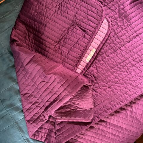 Kaksipuolinen päiväpeitto. Toiselta puolelta tummemman liila ja toiselta vaaleanliila/vaaleanpunertava, vähän käytetty, joten hyvässä kunnossa ja juuri pesty.