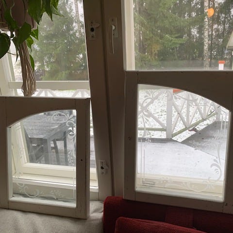 Kaksi samanlaista ikkunapokaa, jäi yli sisustusprojektista. Toisessa lasi, toisessa ei.