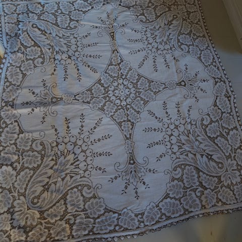 Vanha pitsi lakana ja upeasti kirjailtu tyynyliina. Lakanassa Käsin