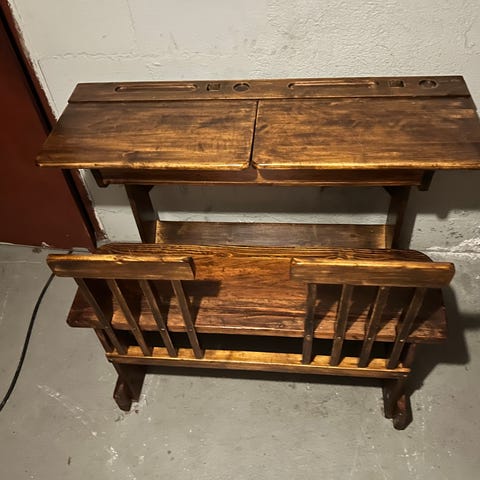 Myydään vanha, täyspuinen kahden istuttava pulpetti. Penkki kiinteästi kiinni pulpetissa.