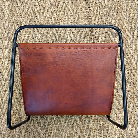 Tämä lehtiteline on aitoa nahkaa ja sävyltään konjakki ja runko on messingin väristä metallia. Lehtitelineen koko on 40x35 cm. Tuote on nähtävänä Petikon liikkeessämme.