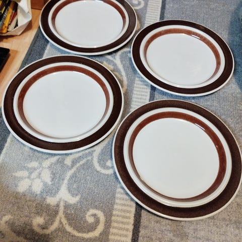 Pienet, syvät lautaset 4kpl (koko 17,5 cm halkaisija ja korkeus 3,5 cm, painot lovi lautanen 260g, 264g, 261g ja reunalovinen lautanen 269g).