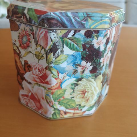 Oikein hyväkuntoinen peltipurkki. Korkeus 24 cm, halkaisija 16 cm. Nouto Tampereella