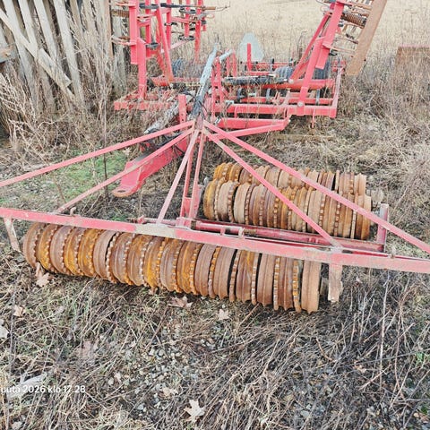 Vanha maatalouskone, joka sisältää kääntöauran ja jyrsimen osat. Kone on valmistettu metallista ja on tarkoitettu maatalouskäyttöön maan muokkaamiseen. Koneessa näkyy ruostetta ja se on säilytetty ulkona osittain suojattuna.