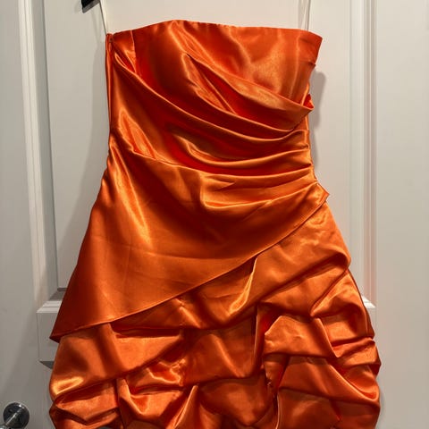 Korallinoranssi juhlamekko. Muutaman kerran käytetty, teipeillä pehmitetty "piikkejä".