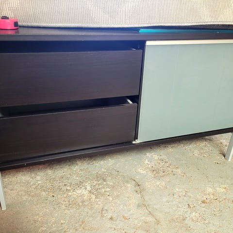 Tosi hyvässä kunnossa. Tason päällä on paksu maitolasi joka kuuluu kauppaan. Vasemman puoleinen ovi lasia, metallikehyksin. Oikeanpuoleinen ovi kalustelevy. Mitat kuvissa.