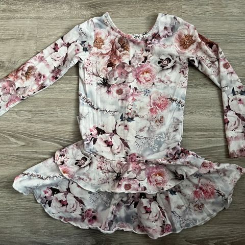Gugguun kaunis frillahelmainen kesämekko (print frilla t-shirt dress) kokoa 110cm, mielestäni vastaa 104cm/110cm kokoa. Ehjä, mutta edessä sivulla ja helmassa laajalti vaaleanvihreää (taideväri?)tahraa, ei lähtenyt peruspesussa, osittain kyllä hukkuu kuosiiin.