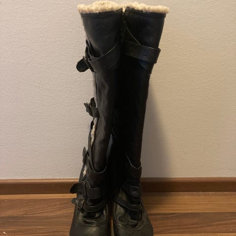 Saappaat ovat uudenveroiset (ovh 79,00 euroa) ja niitä on pidetty kahdesti. Ainoat käyttöjäljet ovatkin ulkopohjissa sekä korkolapuissa, jotka alkuperäisinä muovisina kuluivat nopeasti puhki.