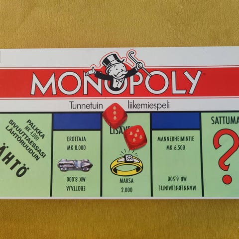 Nopat kyllä hävisi lahjapaketti-rumbassa ja menneet luultavimmin roskiin lahjapaperien kanssa eli nopat puuttuu.
