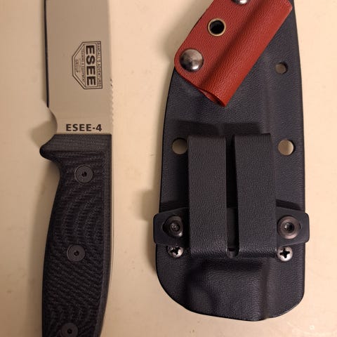 Uusi, täysin virheetön Esee 4 veitsi, joka on valmistettu Rowen Manufacturingin toimesta Idahossa.