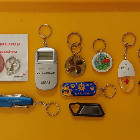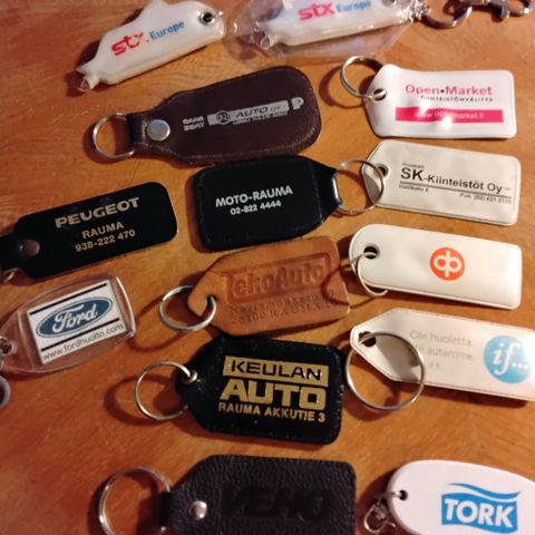 Myydään vanhoja avaimenperiä mm. sotainvalidiliitto, säästöpankki, turun seudun osuuspankki, syp + yksi minkä logoa en tunnista. Kaikki yhteensä 6€.