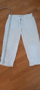 K. 42 puuvillaiset housut. Lahkeessa ihanat rusettinyörit. Vyötärö n. 86cm venyttämättä. Takana kuminauhaa. Etu- ja takataskut. Pituus vyötäröltä lahkeeseen n. 85cm.