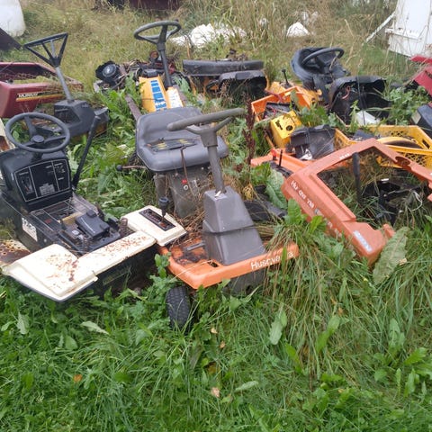 Ehjällä etuakselilla,vanteilla ja renkailla oleva ajoleikkurin raato. Myös jotain pisteosia kiinni.