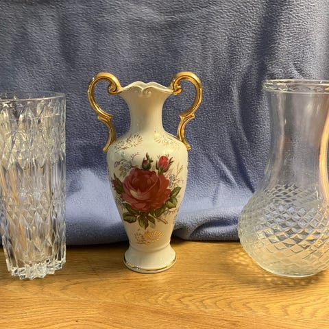 Eri väliset lasimaljakko, yksi kristallia. Yksi keramiikka maljakko. Hinta yhteensä 20 euroa.