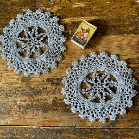 Virkattuja pöytäliinoja. Luonnonvalkoinen.