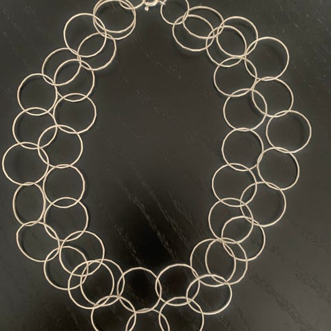 Käyttämätön hopeinen Veteni - niminen kaulakoru. Desigan Päivi Hartikainen. Säilytetty rasiassa, eikä puhdistettu.