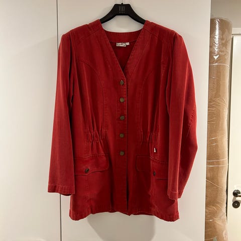 Tyylikäs, musta, satiinia kaulus, taskunläpät ja hihansuut.Napit kultareunoin. Jakun pituus 90cm.Hartianleveys 43cm. Halkiot sivuilla, ei tyköistuva, suora malli Kevyet olkatoppaukset.