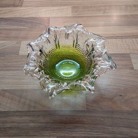 Omenan vihreät jalallinen lasikulho korkeus 12 cm, suun halkaisija 11,5 cm. Käsin tehty pieni lasikannu. Korkeus 13,5 cm. Yhteensä 15 euroa.