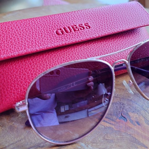 Roxyn pinkkisankaiset aurinkolasit, täysin ehjät, linssit muuten hyvät mutta keskellä alareunassa pieniä halkeamia tai naarmuja(viimeinen kuva). Linssit näyttää kuvissa lilan värisiltä mutta ovat oikeasti sinertävät jopa enemmän vihreät kuin violetit. Mukaan tulee oma laatikko, joka on jo hieman kulunut.