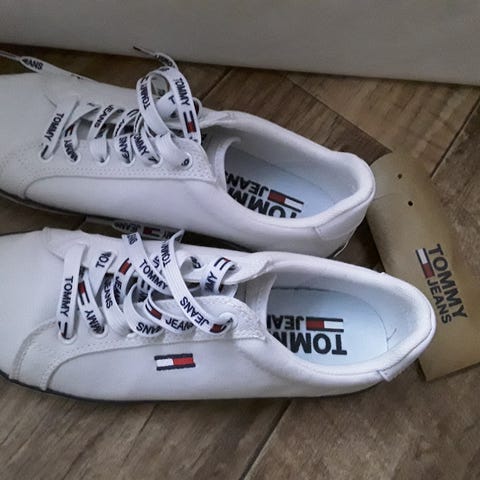 Myydään vähälle käytölle jääneet, hyväkuntoiset, täysin hajuttomat naisten valkoiset Tommy Hilfiger -tennarit. Kengät ovat sisävuorta sekä pohjalaista myöten aitoa nahkaa. Kevyet, koko 38.