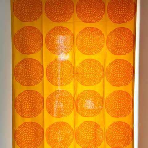 Yksi Vintageverho, jossa hennon luonnonvalkoisella pohjalla vihreät kuviot. Päissä kapeat käänteet.