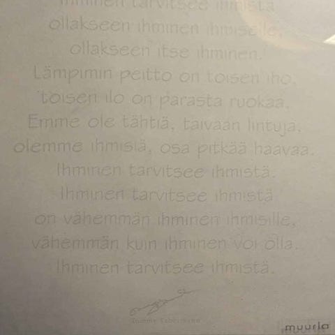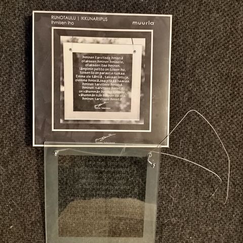 Kaunis lasinen taulu Tommy Tabermannin tekstillä ja Muurlan tarralla. Reunoissa himmeä leveä kantti. Ikkunariipus, runotaulu.