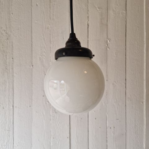 Vanha pallovalaisin. Runko metallia ja kupu opaalilasia. Patinaa ja elämän jälkeä vähä on, mutta ihan asiallinen yleisilmeeltään.