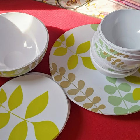 Kauniit , kesäiset vaalean sini valkoiset astiat. Kolme syvää lautasta, neljä ruokalautasta, kolme kahvikuppia , kippo, kannu, kaksi tarjotinlautasta