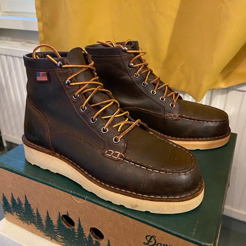 Amerikkalaiset työsaappaat Danner Bull Run Moc Toe STEEL TOE 15564 6”. Täysin uudet. Tilasin Amerikasta, mutta koko osoittautui vääräksi. Kengät on ostettu työkäyttöön – varvassuojallinen teräskärki, paksua öljyttyä nahkaa, mukava pohjallinen. Voin vaihtaa isompaan kokoon, jos jollakulla on sellaiset. Lähetän postikuluitta. Voin lähettää postitse omalla kustannuksellani, jotta ostajan ei tarvitse maksaa Tori.fi:n provisiota. Käyn silloin tällöin Tampereella, voin myös tuoda paikan päälle. Amerikkalaisissa kokomerkinnöissä leveys EE (wide) tarkoittaa leveää lestiä.