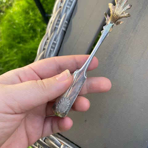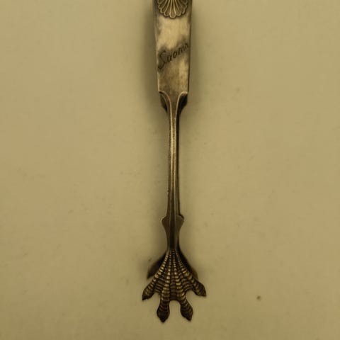 Kotkankynsi sokeripihdit, hopeaa vuodelta 1929, suomalaiset. Toinen palkinto 10 000 metrin juoksusta, monogrammi. Pituus noin 10,5 cm.