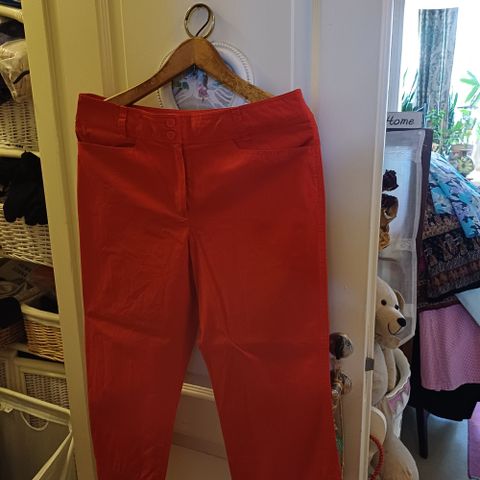 Myydään punaiset 38 koon caprit. Materiaali 76% viskoosia, 20% polyamidia ja 4% elastaania. Hinta 3€.