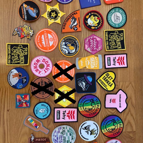 LKS:n 80-vuotisjuhlahaalarimerkki vuodelta 2013 sekä Valkotakit -haalarimerkki. Merkkien halkaisija noin 9cm.