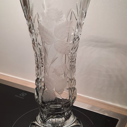 Upea kristallivaasi. Korkeus 25,5 cm, ø 12 cm, paino 1851 g.