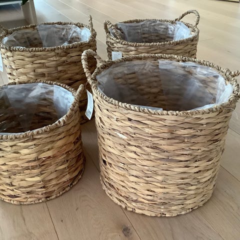 Kadmiumin keltaiseksi akryylivärillä maalattu rottinkikori vaikkapa kesäkukkien istutusalustaksi. Halkaisija: 26cm, korkeus: 13cm.