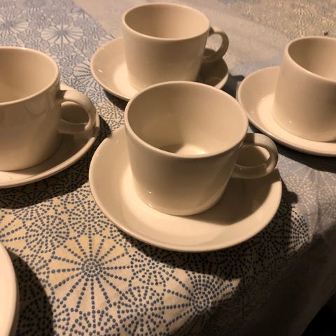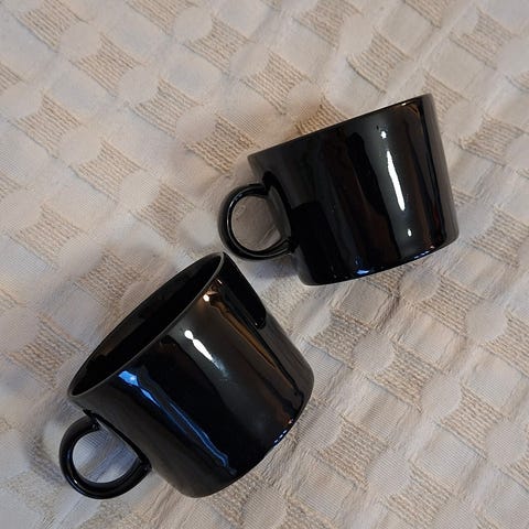 Teeman korvaton muki, musta, 3dl. Kunto hyvä. Suunnittelija Kaj Frank. Myydään yhdessä, yhteensä 12e