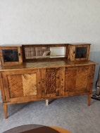 Kaksi ovinen antiikkikaappi, fasettihiotulla peilillä ja kaksi pikkukaappia tason päällä. Pituus on 175 cm, syvyys 49 cm, korkeus tasoon asti 95 cm, sen päällä olevien pikkukaappien korkeus on 33 cm, leveys 36 cm ja syvyys 26 cm. Kaappi jaettu kahteen osaan väliseinällä, ja toisella puolella on hyllyn lisäksi laatikko. Peilissä ajan tuomaa tummuutta, ovien lukot eivät toimi.