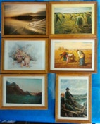 Enemmän tai vähemmän kuuluisia maalauksia ja muita taiteellisia teoksia kopioina (monet postikortteja) pienissä kehyksissä. Aika vanhoja kaikki, kohtuusiistit ja ehjät kehykset, kaikissa lasi, useimmat voi ripustaa seinälle tai pöydälle.
