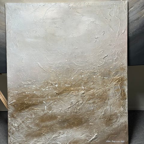 Abstrakti maalaus, jossa kuvattuna puunrungot ja moniväriset, pääasiassa oranssin, valkoisen ja vihreän sävyt. Maalaus on pystysuunnassa ja siinä on käytetty erilaisia tekstuureja ja maalaustekniikoita.