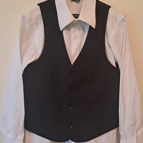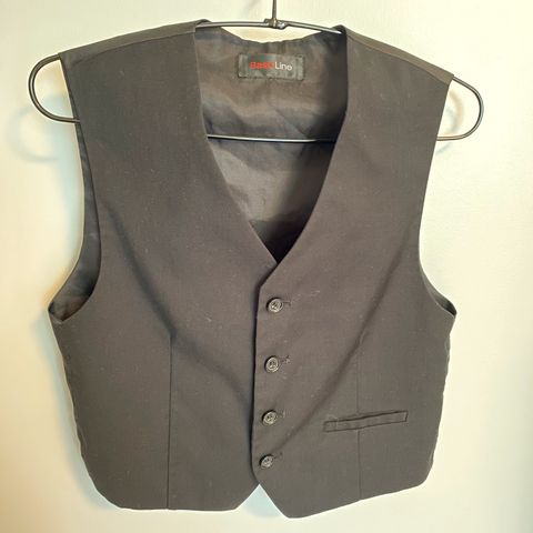 Poikien musta, House-merkin juhlaliivi koossa 140 cm. Liivissä edessä napitus ja takana säädettävä tamppi.