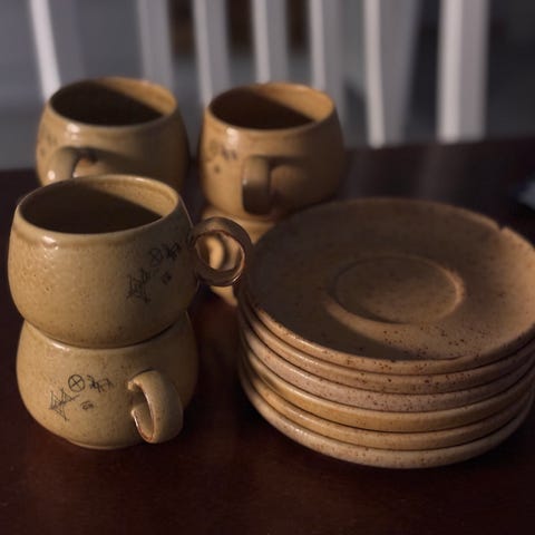 Myydään kaksi Pentikin kahvimukia aluslautasineen yhteishintaan 24 €.