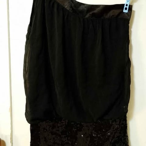 Käyttämättömäksi jäänyt paljettitoppi. Kunto moitteeton. Kai-kai n 47cm, taka pit. n 66cm. Mitat lattialla venyttämättä. Hinta sis pk, noudettuna vähennän pk.