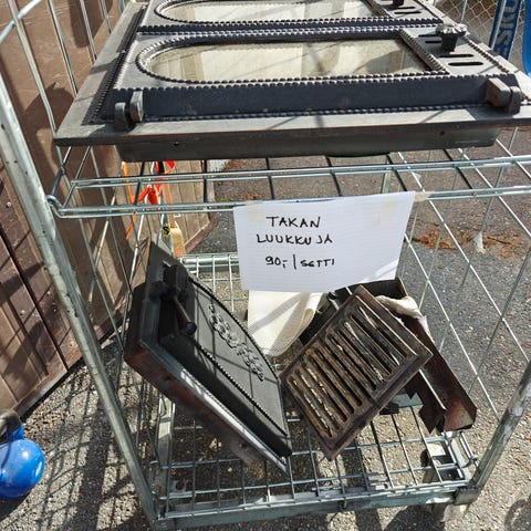 Takan peltikuoret 62cm x 125cm. Harkot (joista osa haljennut) saa halutessaan mukaan. Luukku myydään erikseen.